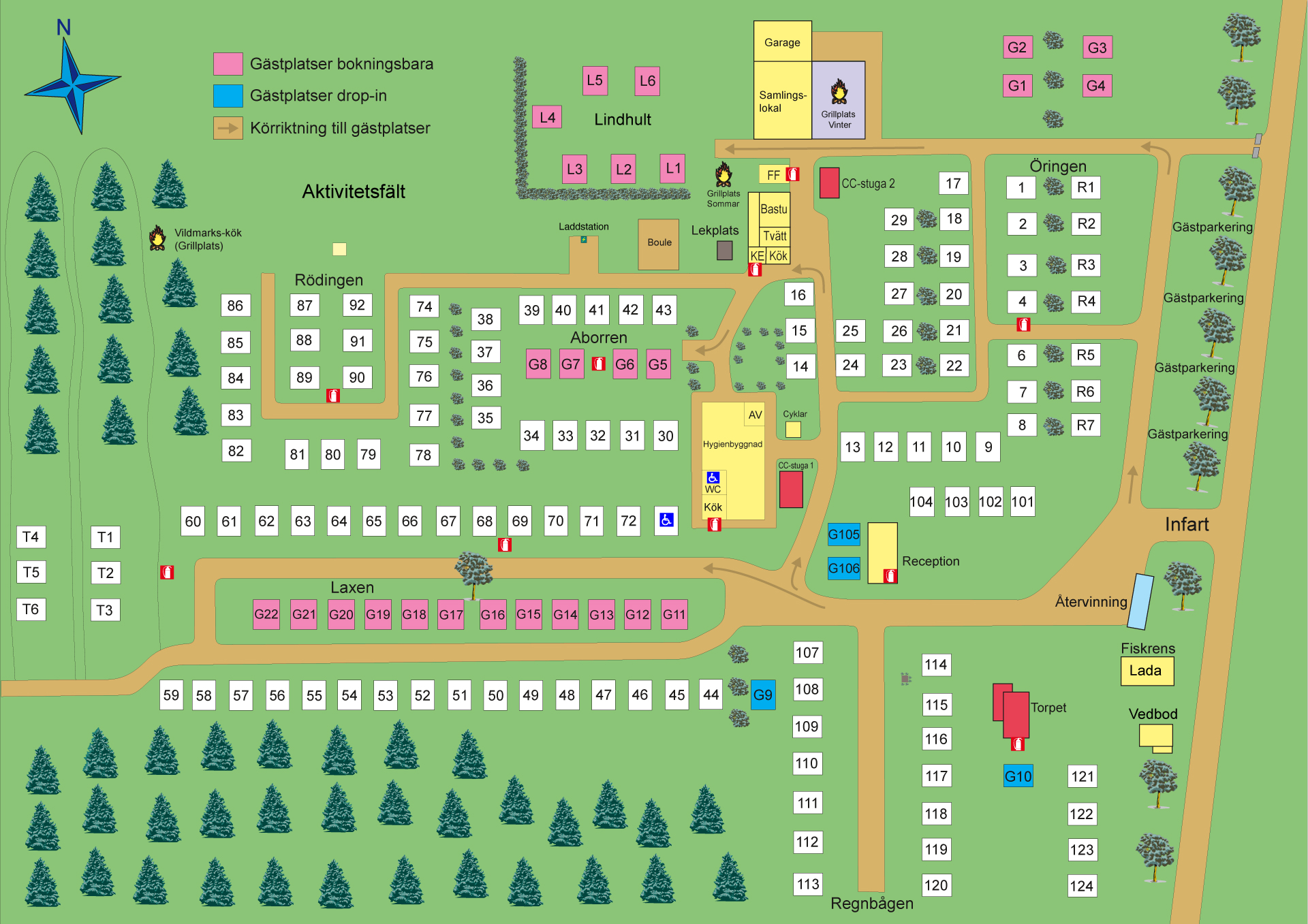 29 gästplatser (1st gästplats tillgänglighetsanpassad, se campingkarta)