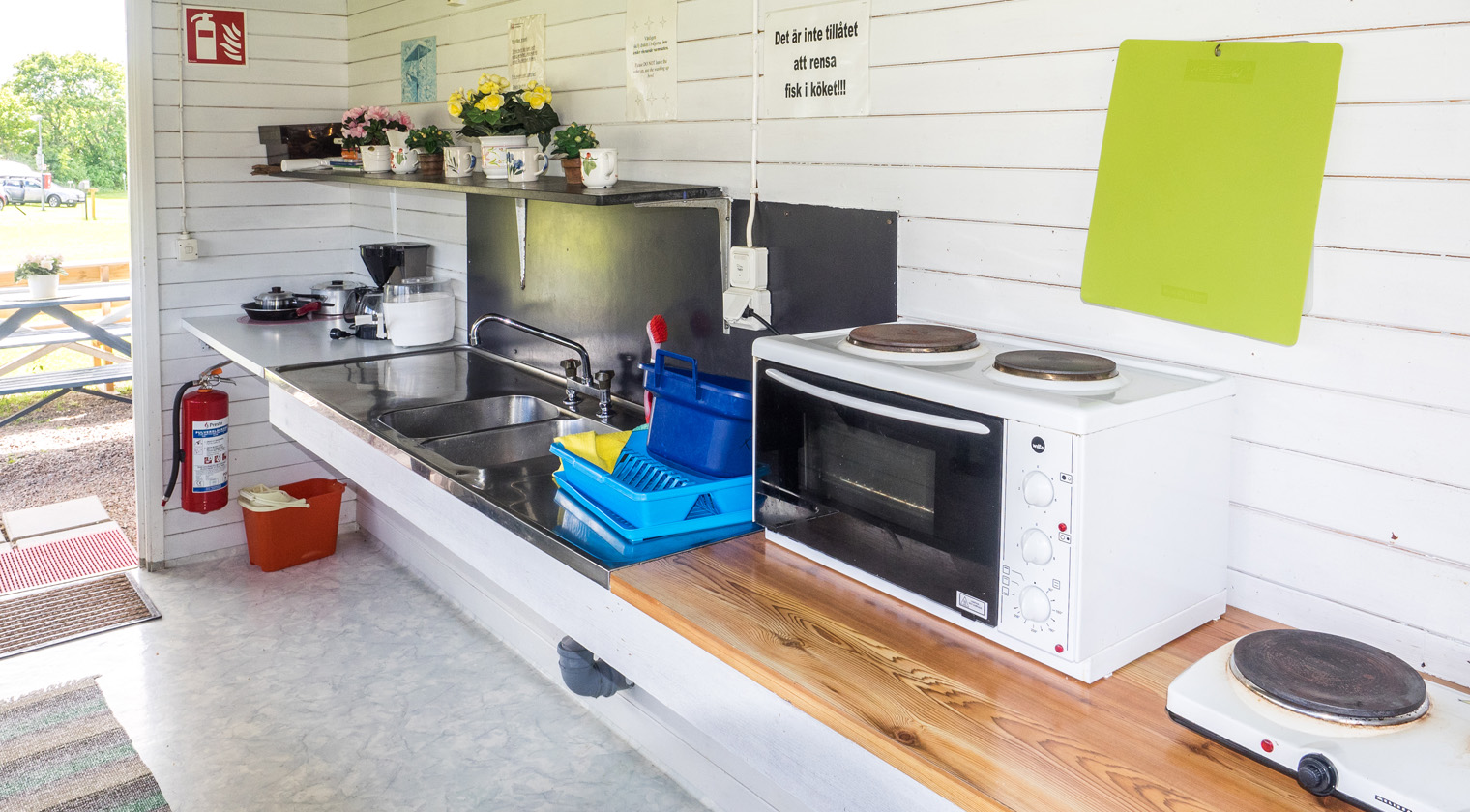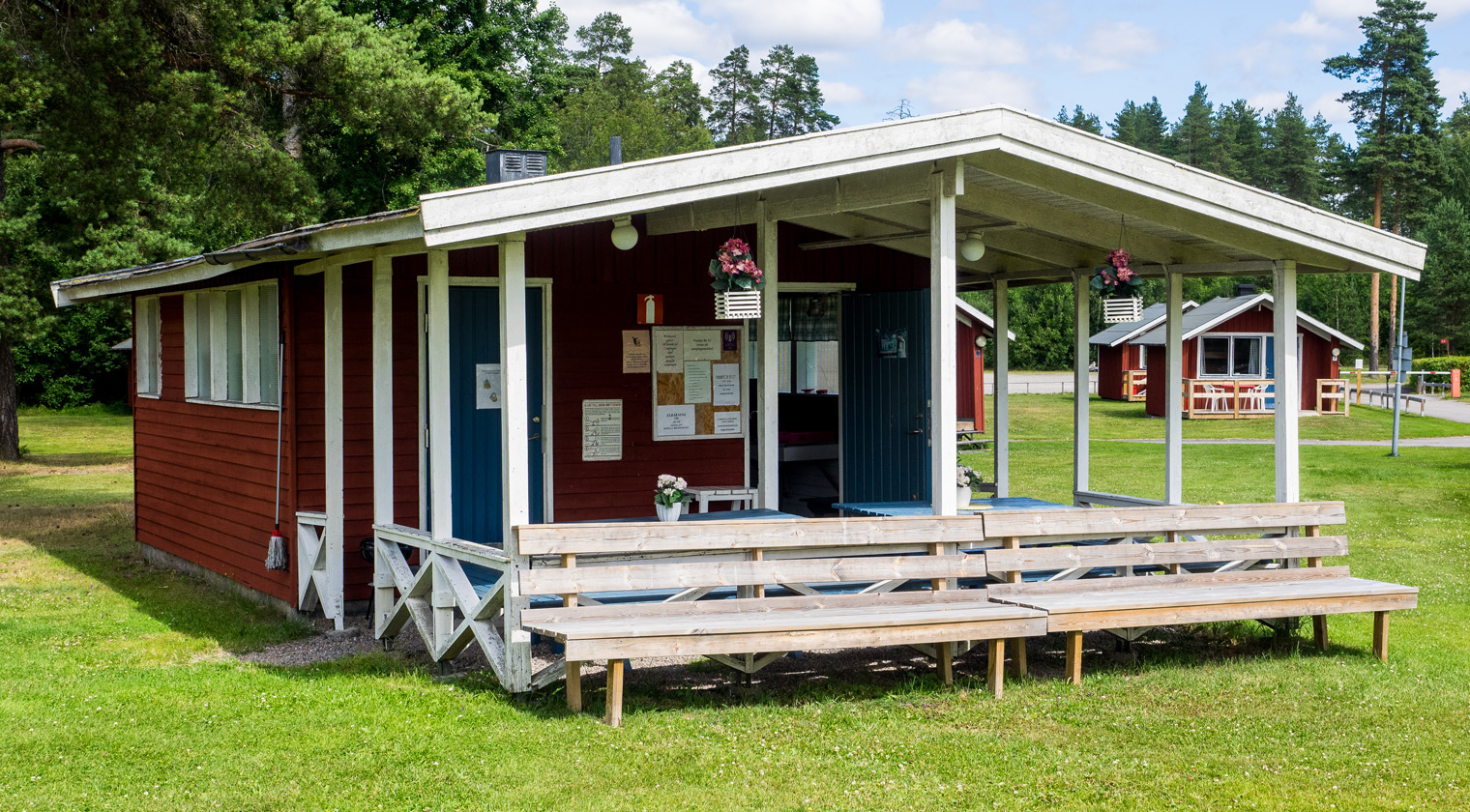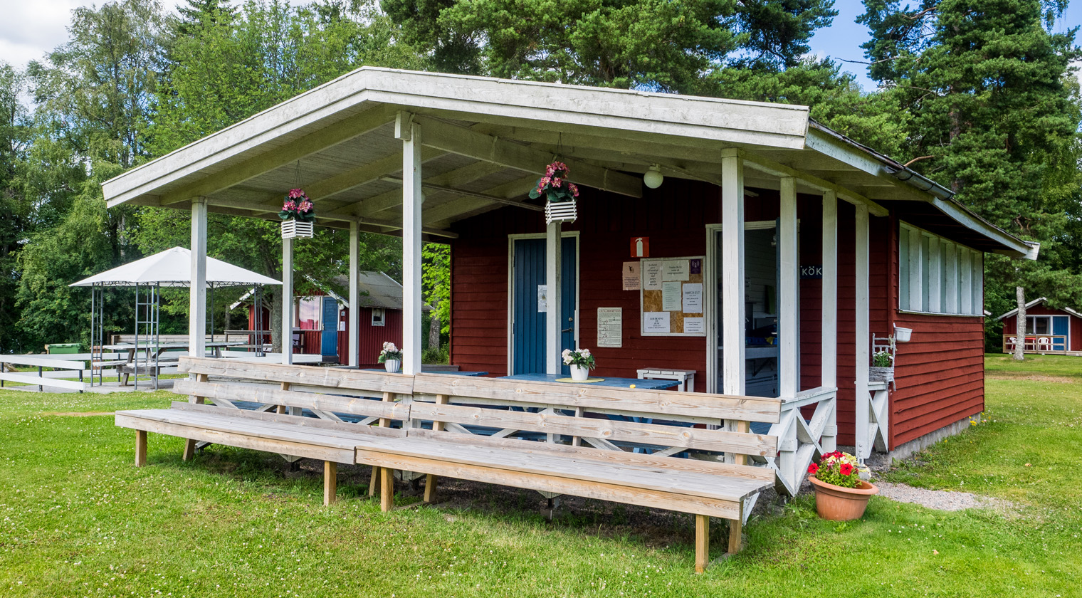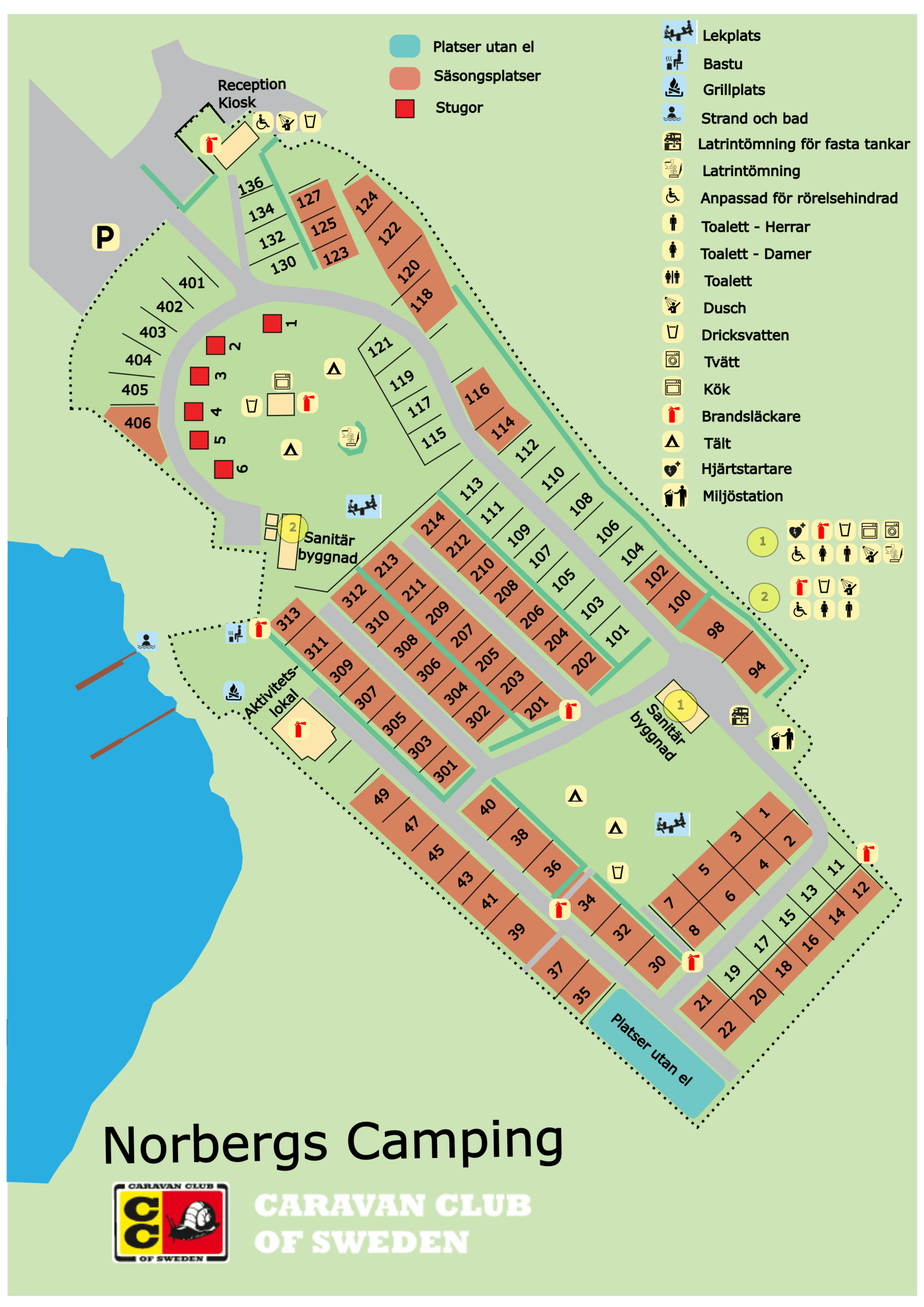 - Servicebyggnad med toaletter och duschar, kök med microvågs-ugnar, spisar, ugnar samt tvättstuga.