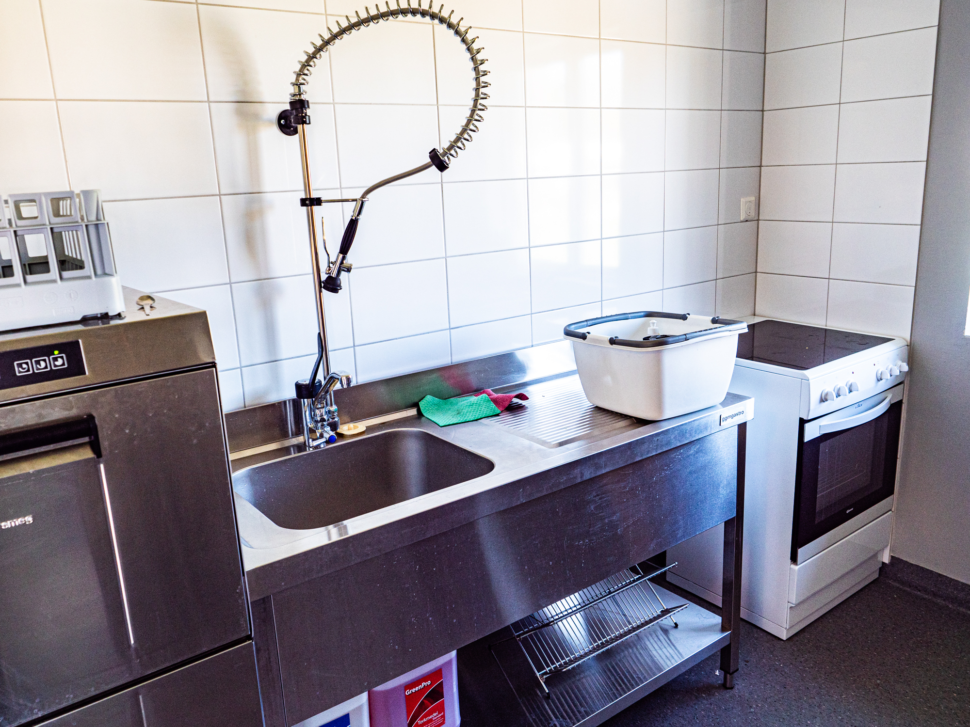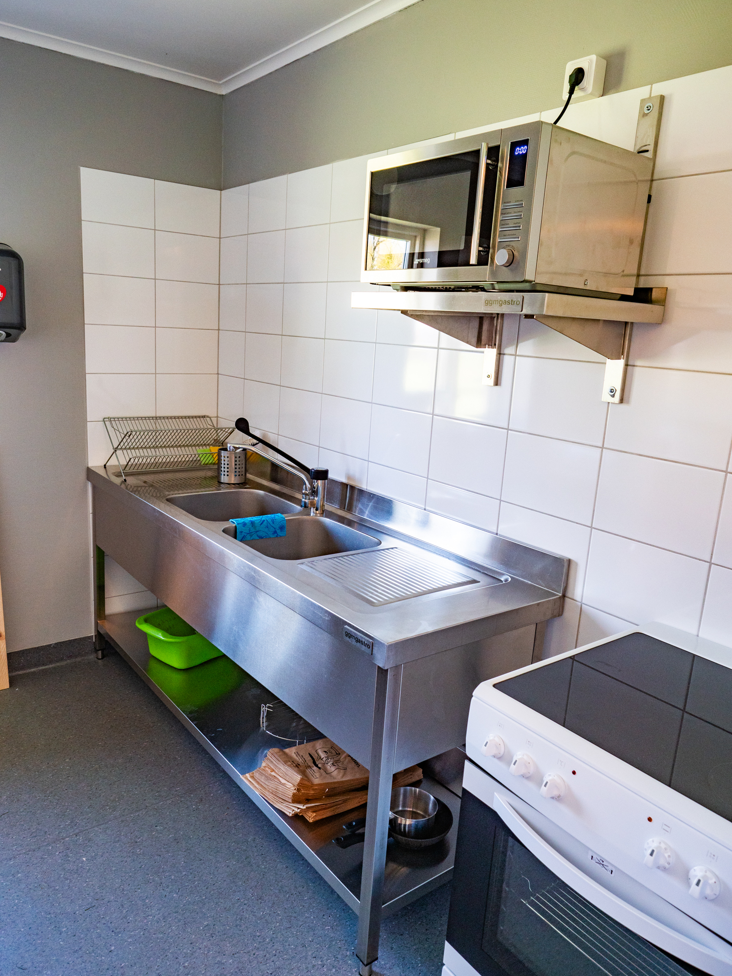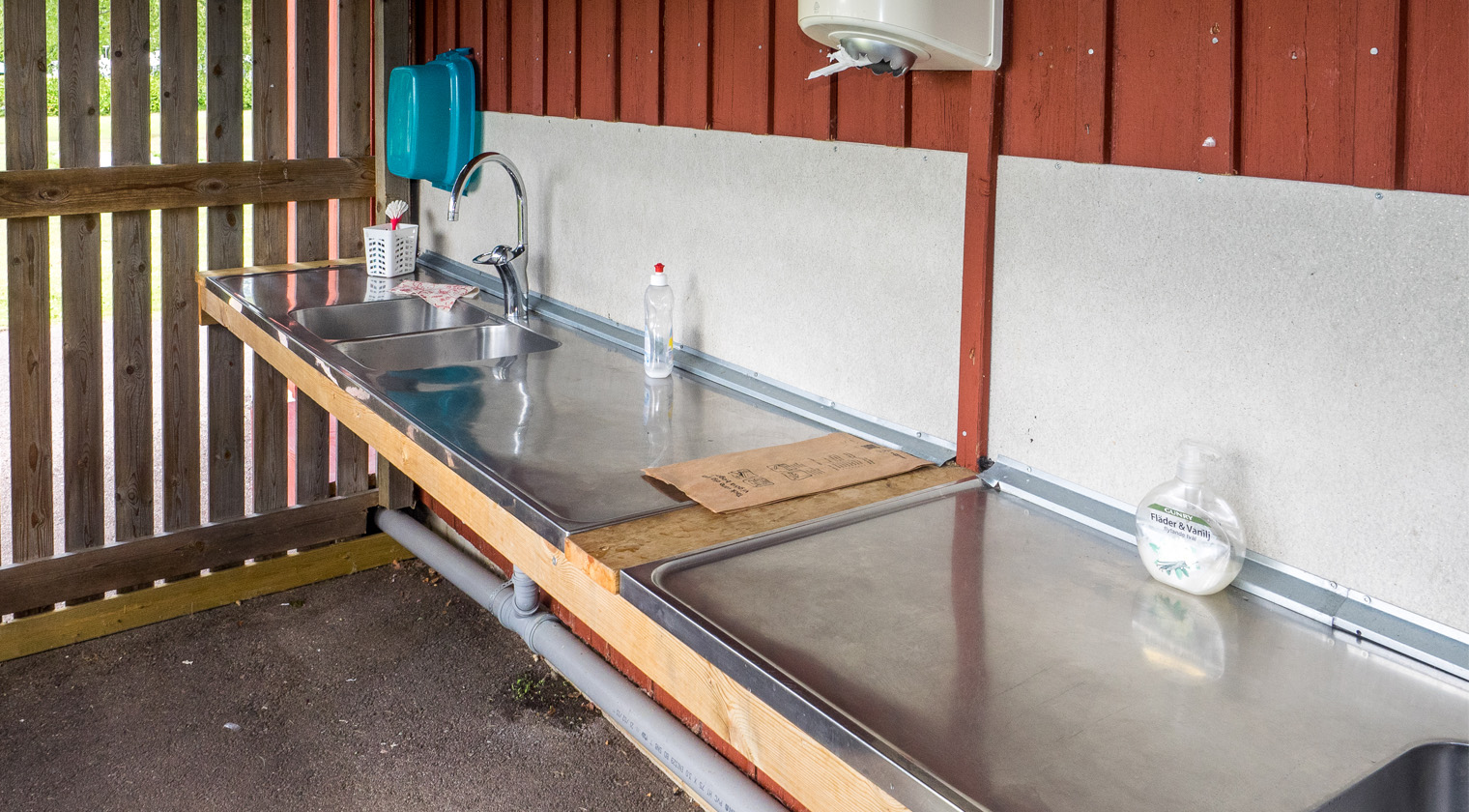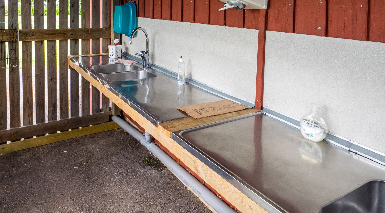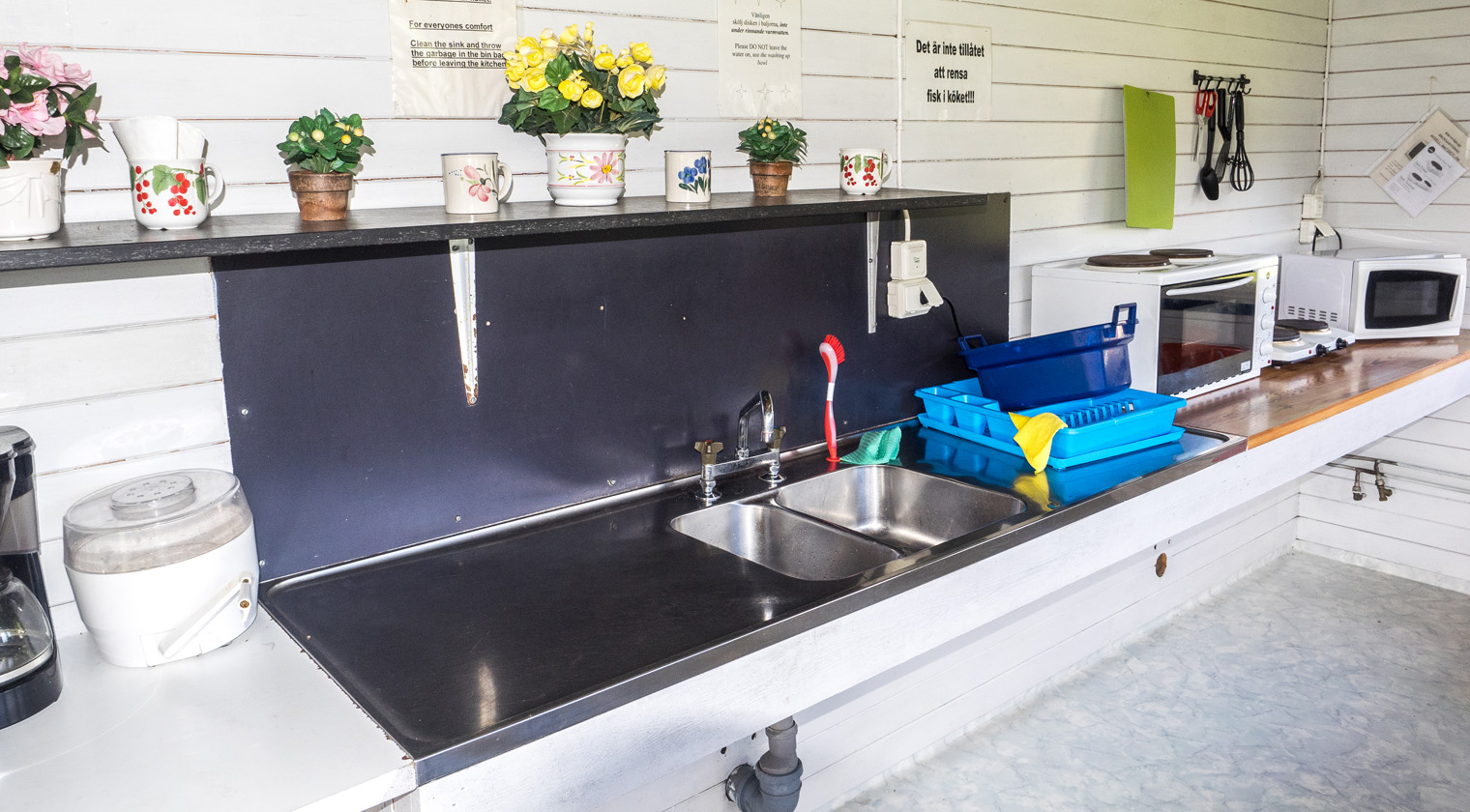 - Servicebyggnad med toaletter och duschar, kök med microvågs-ugnar, spisar, ugnar samt tvättstuga.