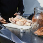 - Klipp bort ryggbenet och vik upp kycklingen så den blir stor och platt. Genom att göra så kortas tillagningstiden med hälften.