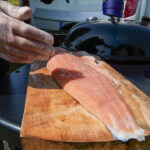 Laxsida på planka är enkel att tillaga. Plankan som laxen ska ligga på finns att köpa hos de stora matkedjorna, men Lasse Bornö använder sig av en tjockare alplanka från Little Hill som håller för 10–15 grillningar innan den brunnit upp.