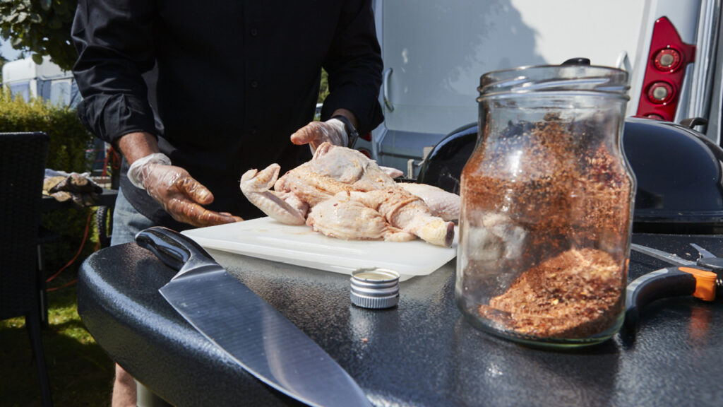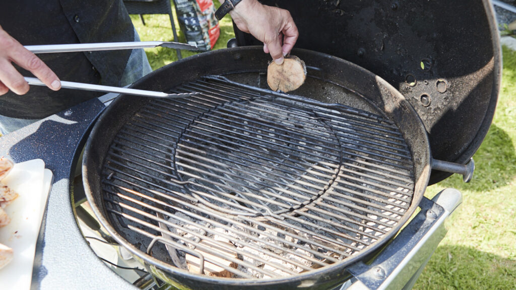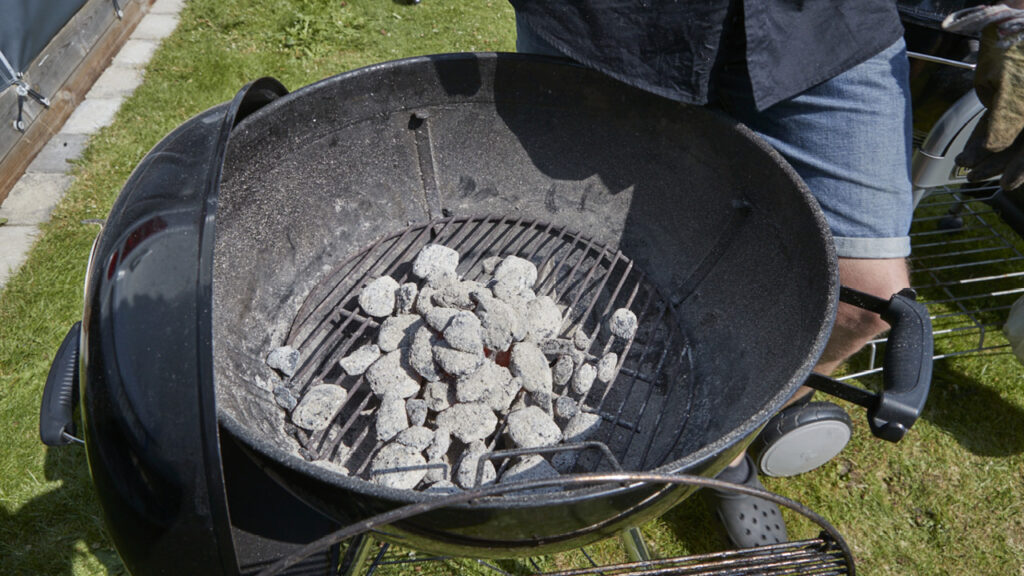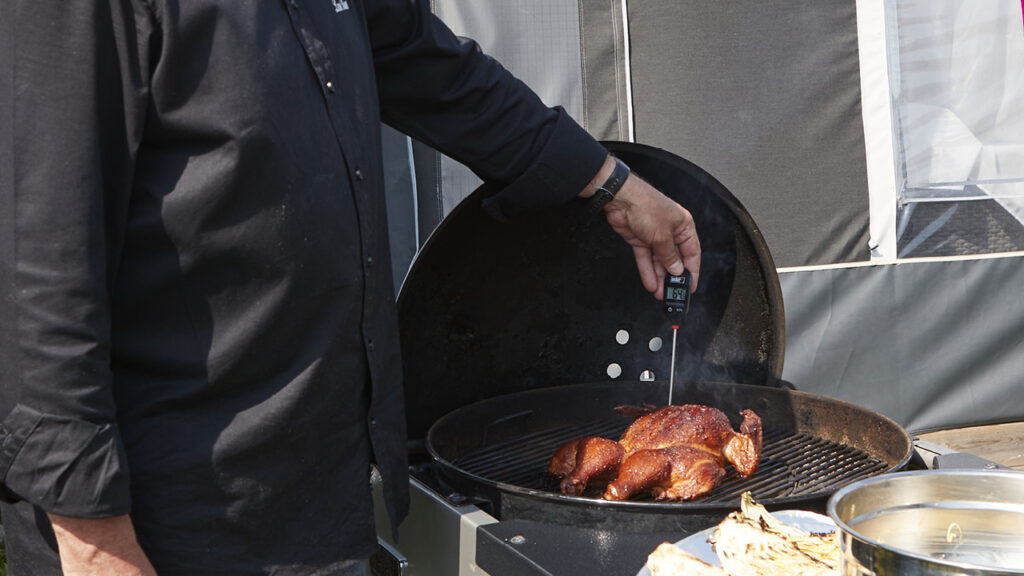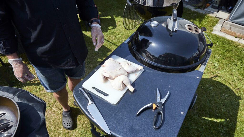 - Kycklingen ska tillagas indirekt i klotgrill med glöden på sidorna av grillen och kycklingen i mitten.