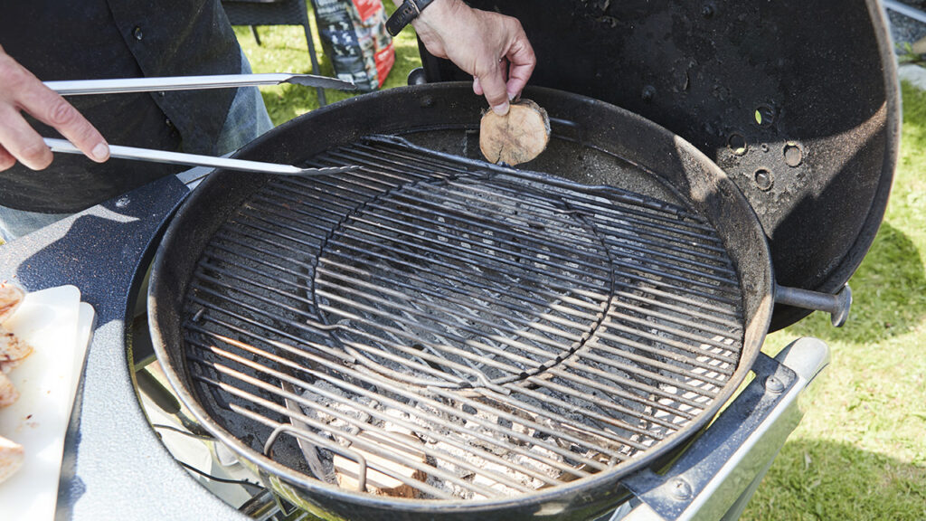 • Lägg gallret ovanpå som vanligt. Plankan med laxen placeras sedan på gallret. Håll avståndet 15 cm från glöd till plankan.
