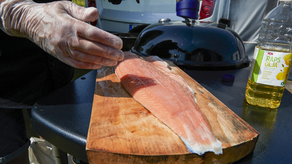 Laxsida på planka är enkel att tillaga. Plankan som laxen ska ligga på finns att köpa hos de stora matkedjorna, men Lasse Bornö använder sig av en tjockare alplanka från Little Hill som håller för 10–15 grillningar innan den brunnit upp.