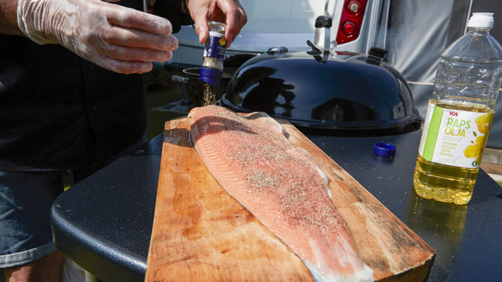 • Krydda laxens ovansida med en halv burk citronpeppar.