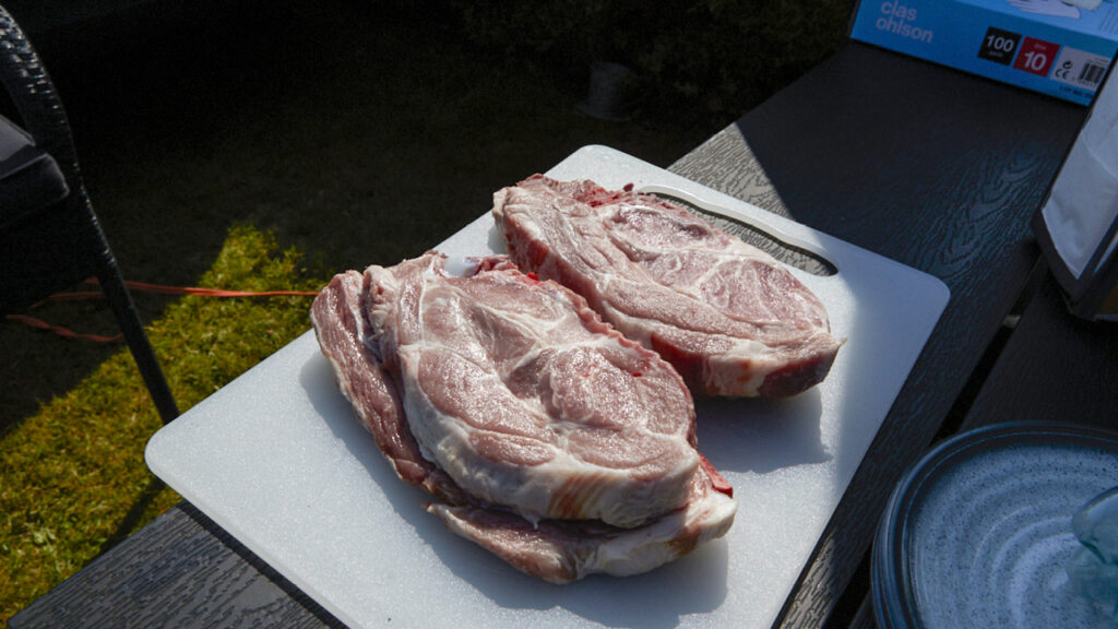Fläskkarrén grillas på vanligt sätt. Senapen binder kryddblandningen på ett bra sätt och kombinationen med ingefäran ger en väldigt god smak.