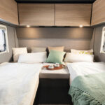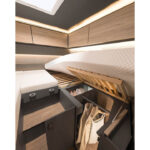 Modellen T/I 7057 DBL har queensbed som är ställbar på höjden. Tre av de nya Trend-planlösningarna finns med enkelsängar – som standard lågt placerade, som tillval även som hög version för mer förvaring i garaget bak. De integrerade modellerna har taksäng i förarhytten som standard och de halvintegrerade har tillvalet elektrisk taksäng över sittgruppen.