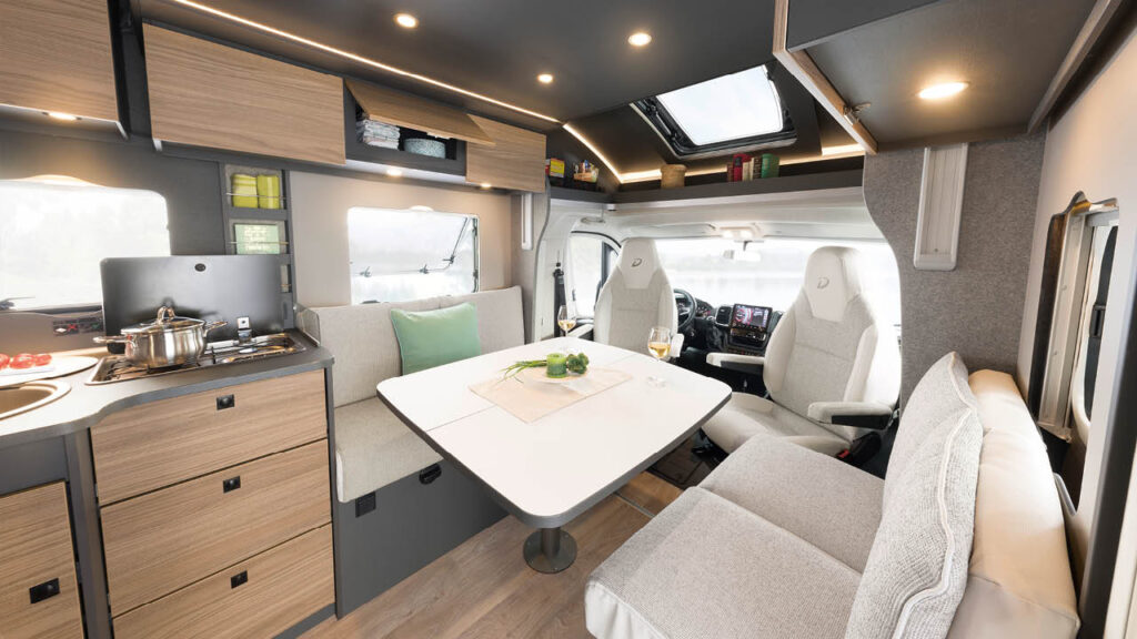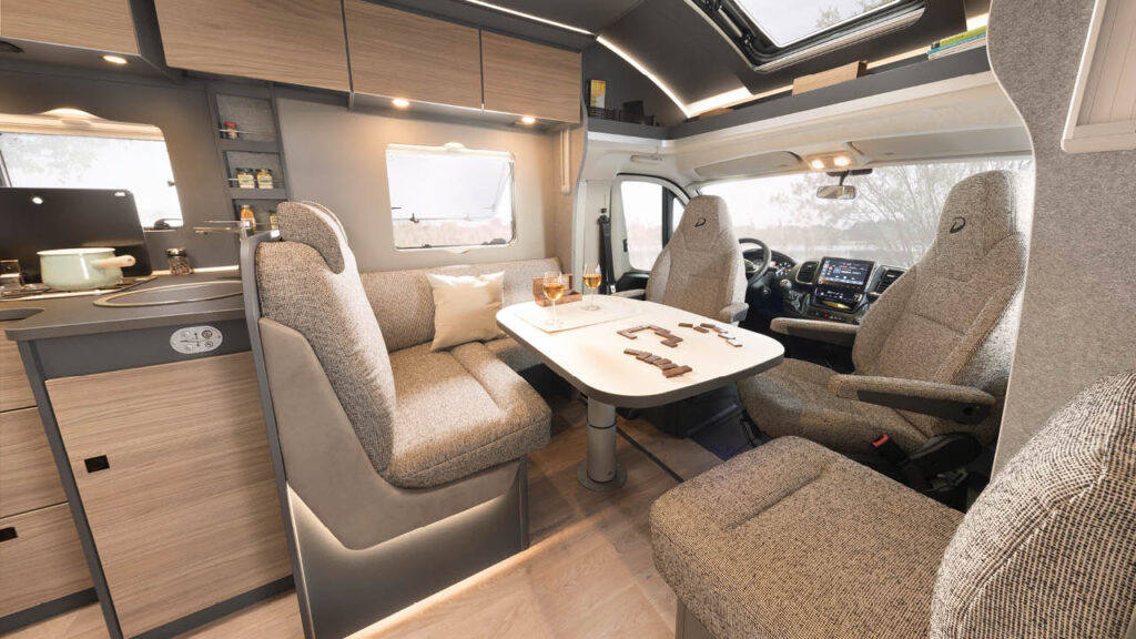I versionerna T/I 7057 EBL och DBL bildar två längsgående bänkar tillsammans med kaptensstolarna en rymlig sittgrupp för upp till sex personer. De övriga planlösningarna erbjuder en klassisk halvdinett med tvärställd sittbänk på andra sätesraden.
