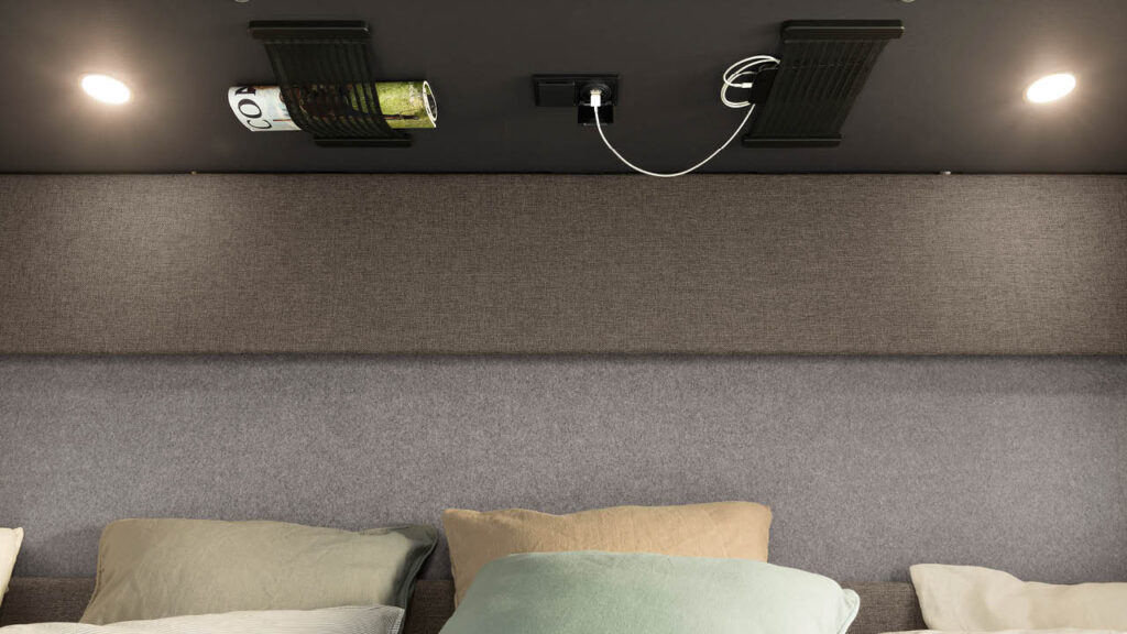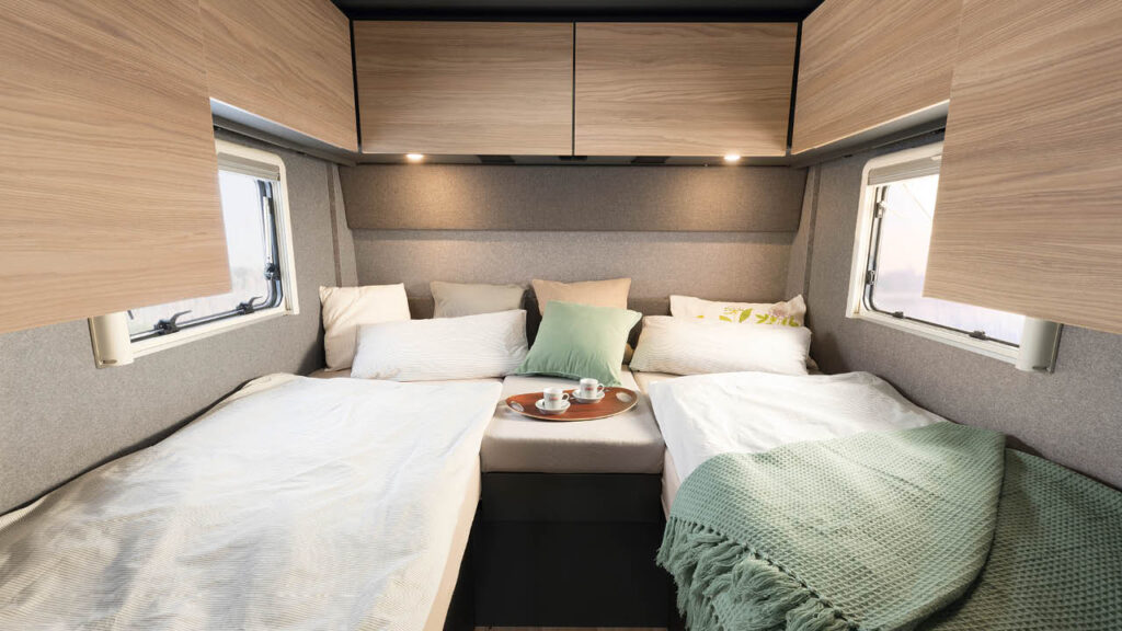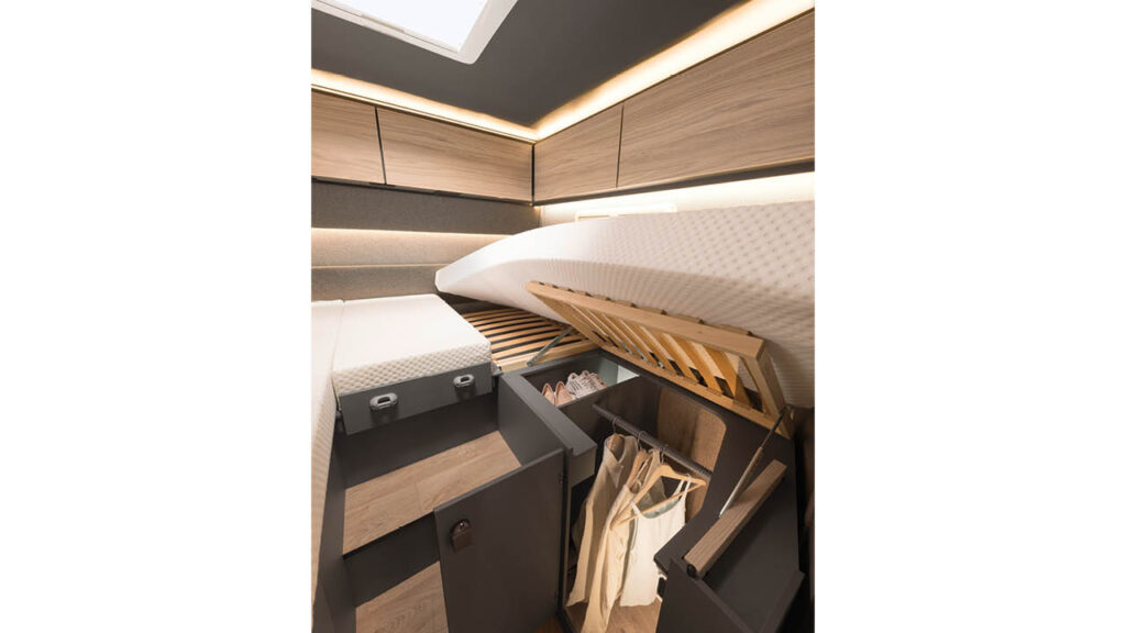 Modellen T/I 7057 DBL har queensbed som är ställbar på höjden. Tre av de nya Trend-planlösningarna finns med enkelsängar – som standard lågt placerade, som tillval även som hög version för mer förvaring i garaget bak. De integrerade modellerna har taksäng i förarhytten som standard och de halvintegrerade har tillvalet elektrisk taksäng över sittgruppen.