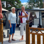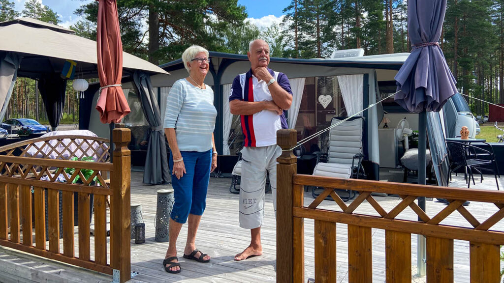 På den så kallade Gräddhyllan – gästplatserna närmast vattnet – står caravanarna Ingegjerd och Gunnar Einarsson från Hällbybrunn utanför Eskilstuna med sin husvagn. De bor på Mangenbaden för andra gången.