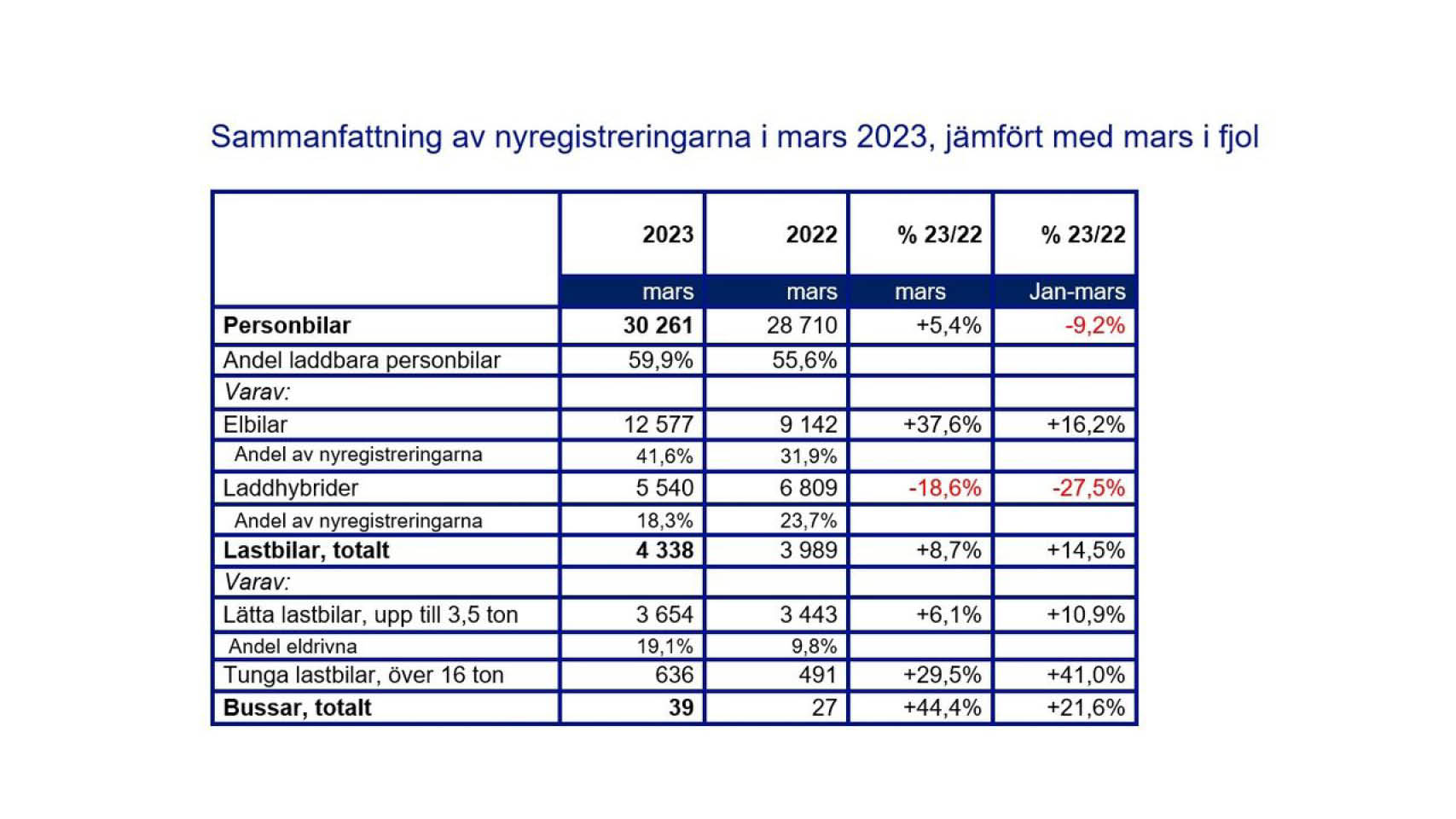 Tunga fordon fortsätter ha en fortsatt positiv utveckling även under mars månad där tunga lastbilar ökade med cirka 30 procent och bussar med drygt 44 procent jämfört med mars 2022. Under årets första kvartal har 62 eldrivna tunga lastbilar registrerats, vilket motsvarar 3,9 procent. Under samma period uppgår antalet nya eldrivna bussar till 32, vilket motsvarar nära var fjärde registrering under årets tre första månader. Antalet nya lätta lastbilar ökade med cirka sex procent i mars i jämförelse med samma månad i fjol. Andelen eldrivna lätta lastbilar uppgick till 19,1 procent i mars och till 13,4 procent under första kvartalet.