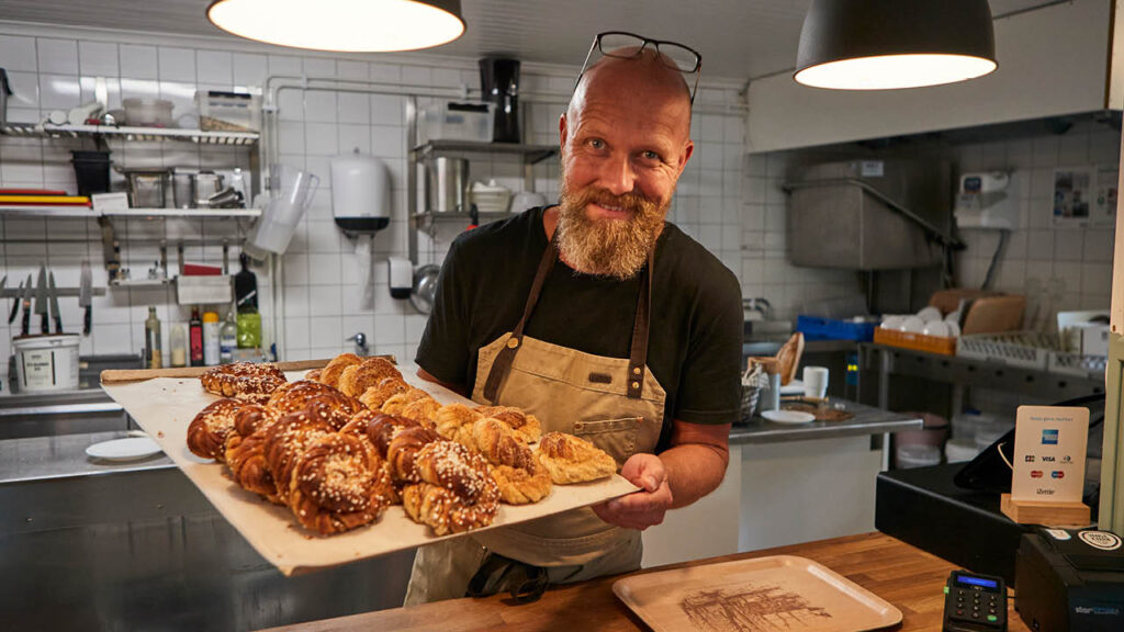 – Och så har vi vårt vanliga fikautbud såklart. Dessutom har vi alltid bageriet öppet när kaféet är öppet så det går att köpa med sig bröd, småkakor, marmelad med mera.