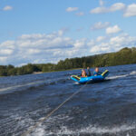 Det går att roa sig även med andra vattenaktiviteter i Skånes största sjö Ivösjön. Emmie och Kasper Pihl åker även gärna det de kallar för ”plattan” efter motorbåten. På den kan man sitta flera stycken.