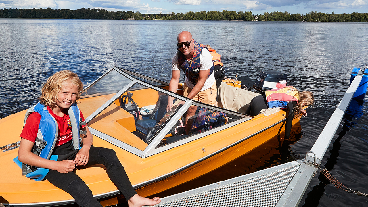 Han har varit på Söndremark camping nästan varje sommar sedan han var liten och numera är det han som ansvarar för tävlingen. Den här julidagen åker han vattenskidor med sonen Kasper, 11 år, dottern Emmie, 8 och deras kompis Ellen Bengtsson. Emmie gjorde sin första start i Slalomtricket redan när hon var sex år.