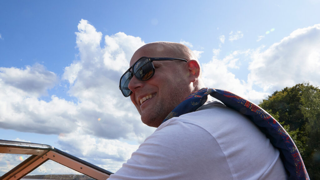 Han har varit på Söndremark camping nästan varje sommar sedan han var liten och numera är det han som ansvarar för tävlingen. Den här julidagen åker han vattenskidor med sonen Kasper, 11 år, dottern Emmie, 8 och deras kompis Ellen Bengtsson. Emmie gjorde sin första start i Slalomtricket redan när hon var sex år.