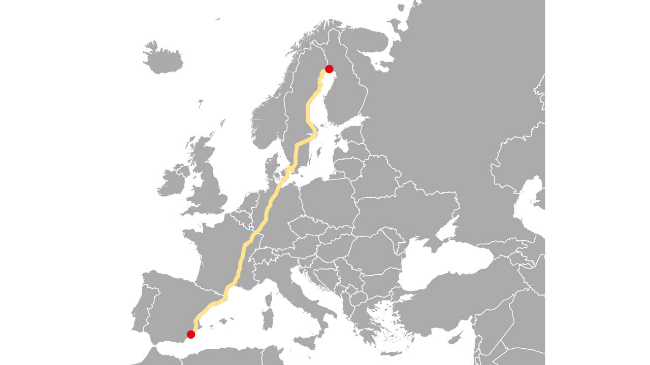 Kör genom Sverige till färjan Trelleborg–Rostock. Därefter mot Greven, norr om Dortmund, som har en suverän ställplats med en fantastisk restaurang. Fortsätt till Moseldalen och en ställplats som heter Ernst. Väl inne i Spanien vid Medelhavskusten finns en by som heter Roses, med både en mysig ställplats och camping.
