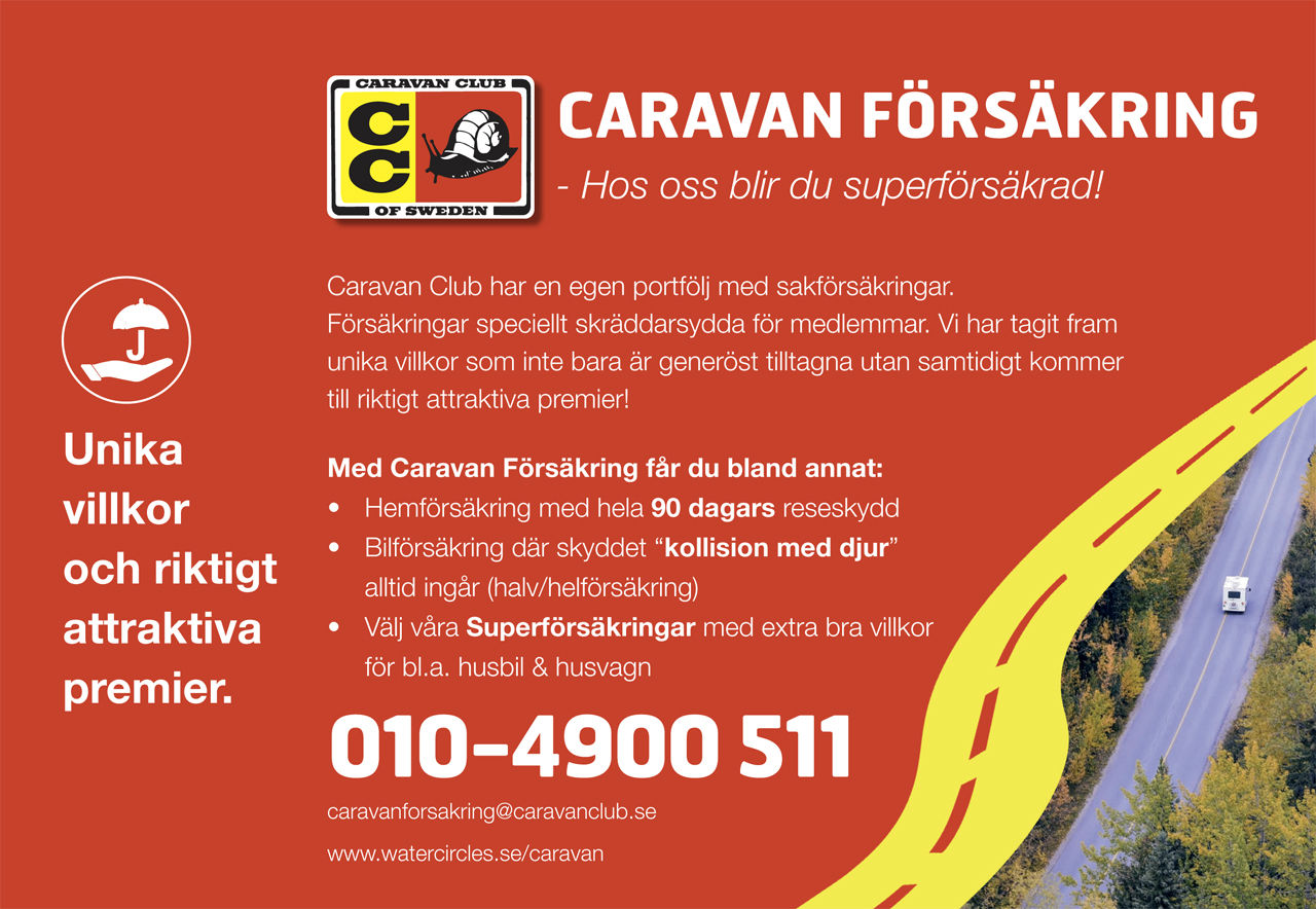 Caravan Club of Sweden har en egen portfölj av sakförsäkringar som ger alla våra medlemmar en mer eller mindre unik försäkring med mycket bra villkor.