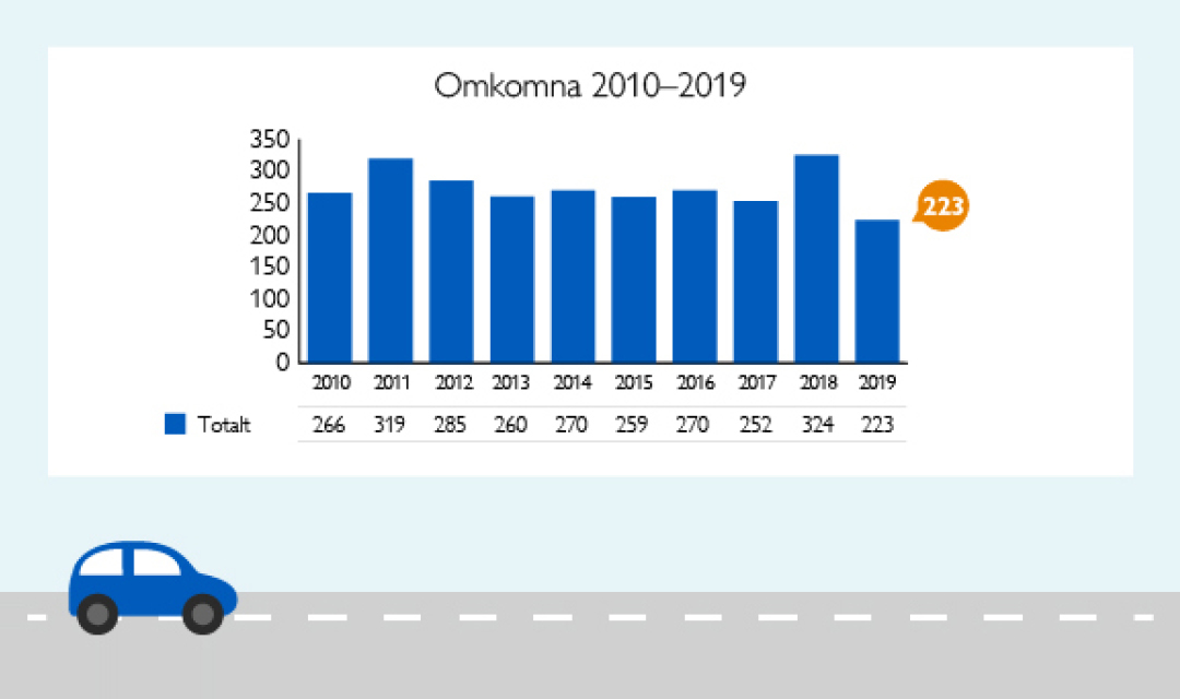 Under 2019 omkom 223 personer i olyckor på de svenska vägarna. Det är betydligt färre än 2018 då 324 människor omkom. Det visar Transportstyrelsens preliminära statistik.