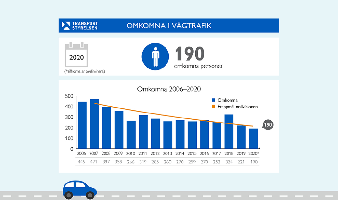 Under 2020 omkom 190 personer i olyckor på de svenska vägarna. Det är 31 färre än 2019 då 221 människor omkom, enligt Transportstyrelsens preliminära statistik.