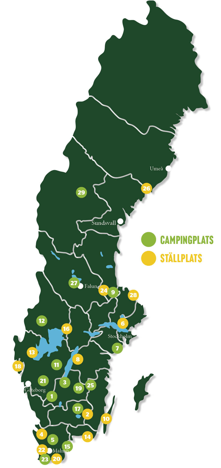 Fritidsmagasinet har de senaste åren besökt många platser i Sverige. Platser där camping eller ställplats finns eller i platsens närhet. Campingplatserna, förutom våra egna, är campingar som precis som vi i Caravan Club är medlemmar i organisationen Svensk Camping.